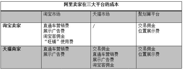 C2C業務,即淘寶,收入主要來自于賣家的營銷費用;B2C業務中,天貓主要靠交易額傭金收錢,而聚劃算的收入主要來自賣家的展示廣告位置費。下圖中可以清楚的看出,淘寶和天貓賣家在阿里不同平臺上做生意,都需要支出哪些成本: