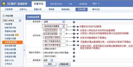 系統默認主動發起次數為一次,如果害怕訪客誤操作關閉,則可以設置反復發起對話邀請。此時,可以設置各種彈出邀請框的參數,如:重復發起的時間間隔、每個頁面最多彈出邀請框的次數等等。當勾選了反復發起間隔30秒,則在訪客離開前,系統將每隔30秒主動反復發起邀請對話。