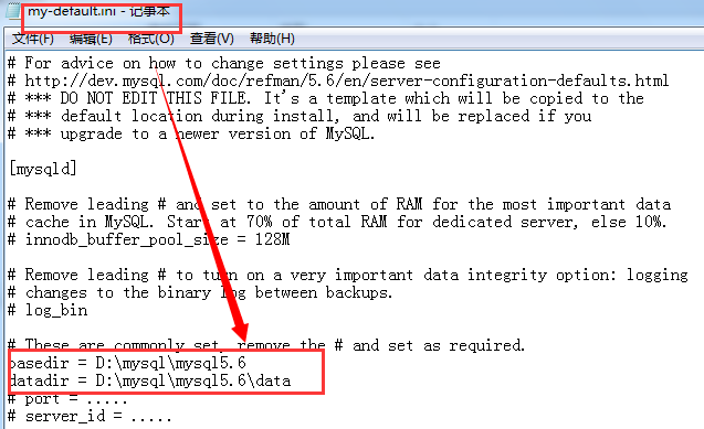 進入這個路徑然后找到my-default.ini,用記事本打開,修改文件中內容basedir和datadir的值,主要是填寫安裝的路徑和data保存的路徑,正確填寫如下圖:
