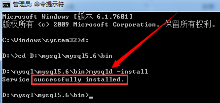 管理員權限打開控制臺,找到安裝Mysql的bin目錄,然后使用mysqld –install命令安裝,如下圖安裝成功: