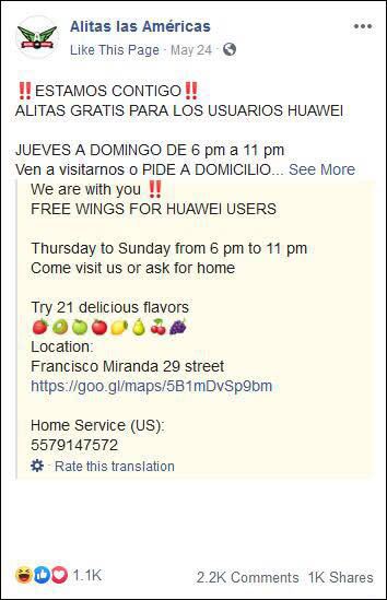 表示支持的還有墨西哥的一家炸雞餐廳,這家餐廳社交媒體上表示,理解你的痛苦,免費贈送雞翅,只要使用華為設備,購買雙人套餐就可以免費獲贈雞翅。