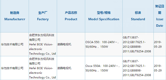 盡管此前華為方面多次公開表示不涉足家電領域,但華為消費者業務CEO余承東也曾透露會推出智能大屏設備。目前看來,OSCA-550和OSCA-550A兩個型號的電視很可能對應55英寸的智能電視產品。